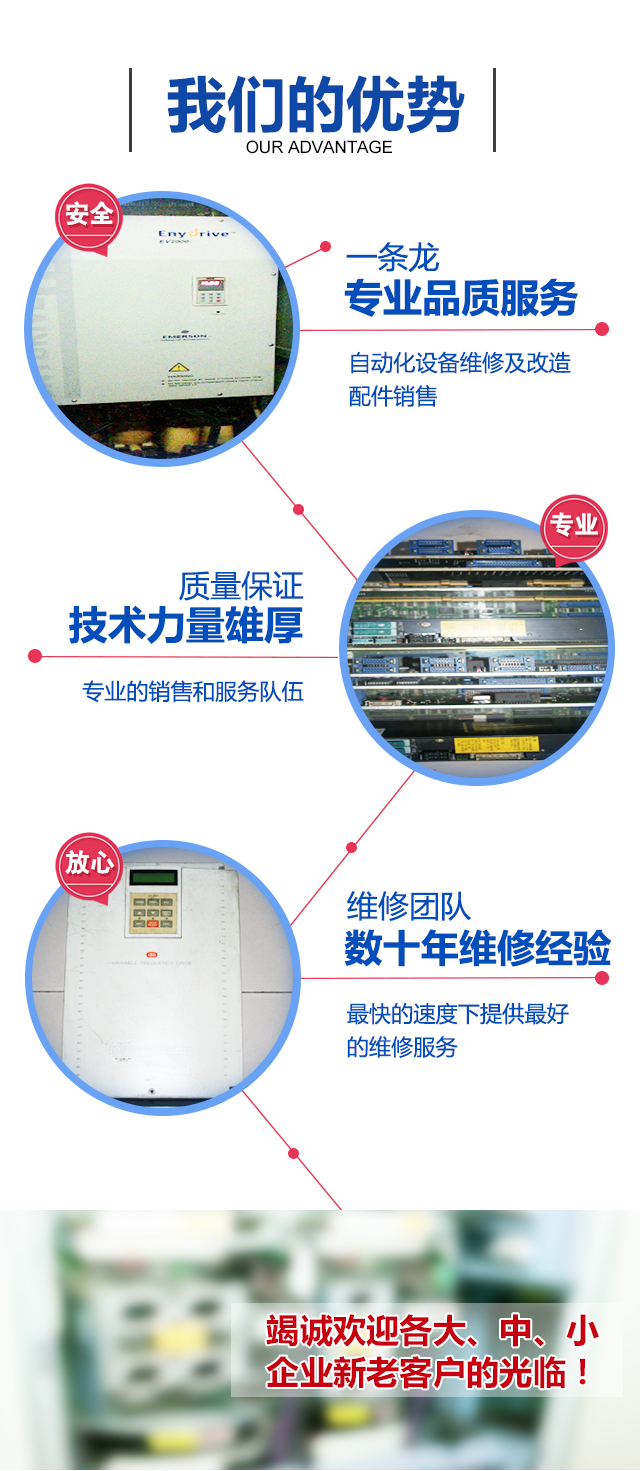 沈阳鸿瑞自动化设备维修有限公司是一家集数控设备,工控设备、自动化设备维修及改造,配件销售为主的一体化公司,专业从事各种电子线路板,控制系统,伺服驱动器,伺服电机,变频器、直流调速器、PLC,触摸屏,工控机,工业电源等维修和服务,拥有专业的销售和服务队伍,现有电路板维修工程师以及现场调试工程师多人,技术力量雄厚,公司并备有集成电路在线测试仪,信号发生器,频率计,示波器等测试设备。拥有专业的维修团队和丰富的维修经验心得,配件齐全,能快速提供好的维修服务,为顾客解决燃眉之急、保驾护航。本着“信誉第一,诚信为本”的服务宗旨,“专业品质,服务至上”的服务精神,以及优质的售后服务,取得了广大客户的青睐与信任。竭诚欢迎各大、中、小企业新老客户的光临!
